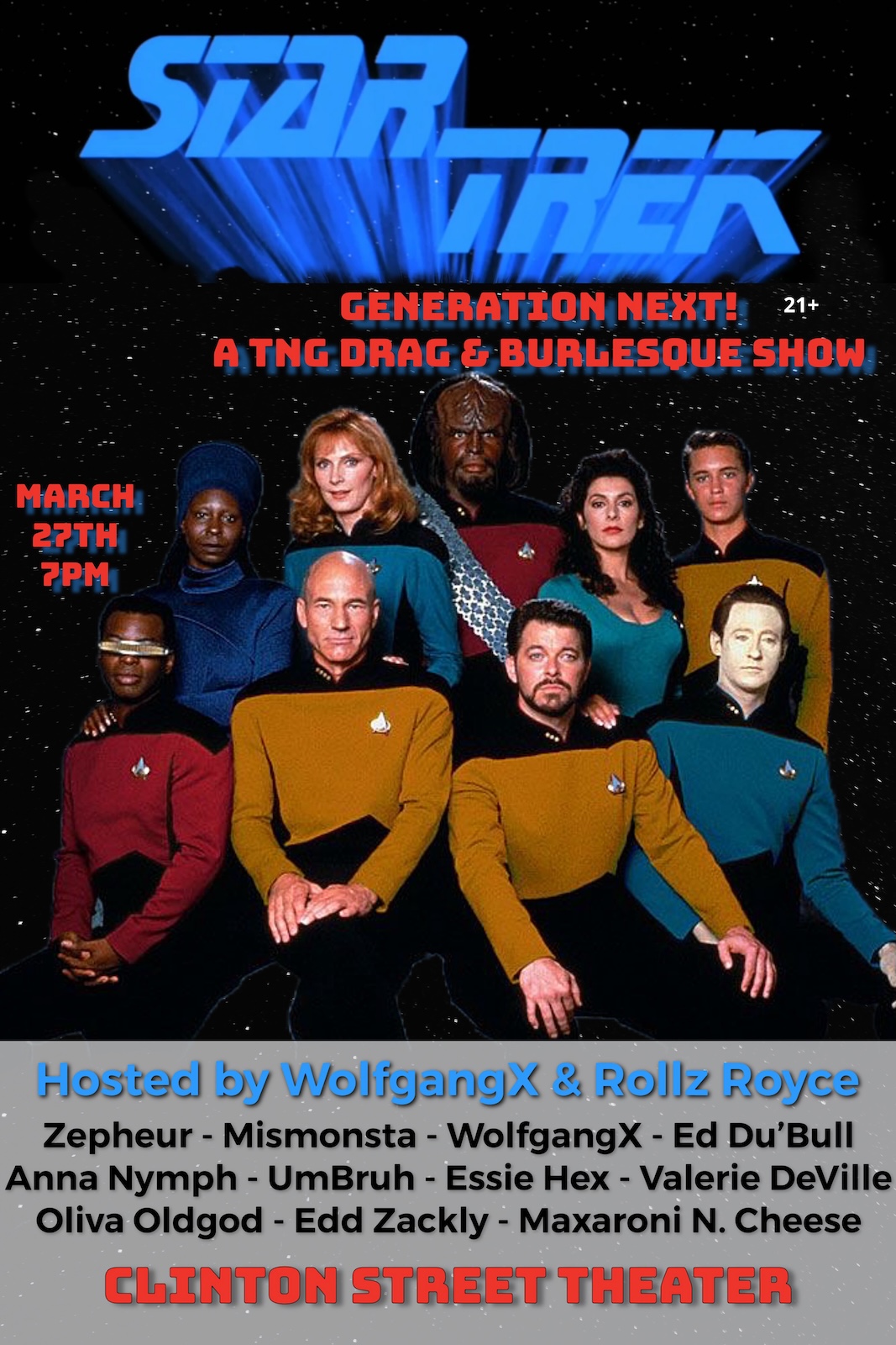 Q has once again kidnapped the Enterprise crew and thet must performer acts of Drag & Burlesque to get out. A Scripted night that leads into all the acts based on your favorite TNG characters.