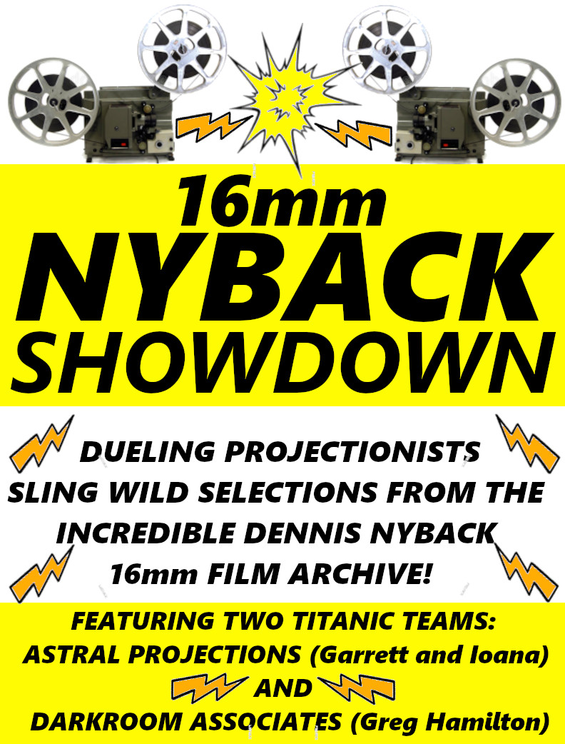 Watch as two 16mm programming teams (Darkroom Associates and Astral Projections) fire up their projectors and trade cinematic jabs back and forth by screening selections from the world-famous Dennis Nyback 16mm film archive!