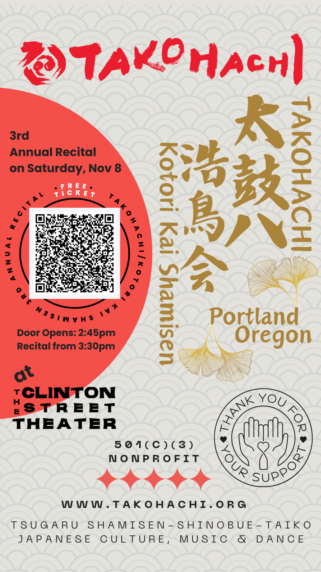Enjoy the performance with suggested donations, explore the silent auction, and celebrate local businesses alongside TAKOHACHI and Maido Mind.