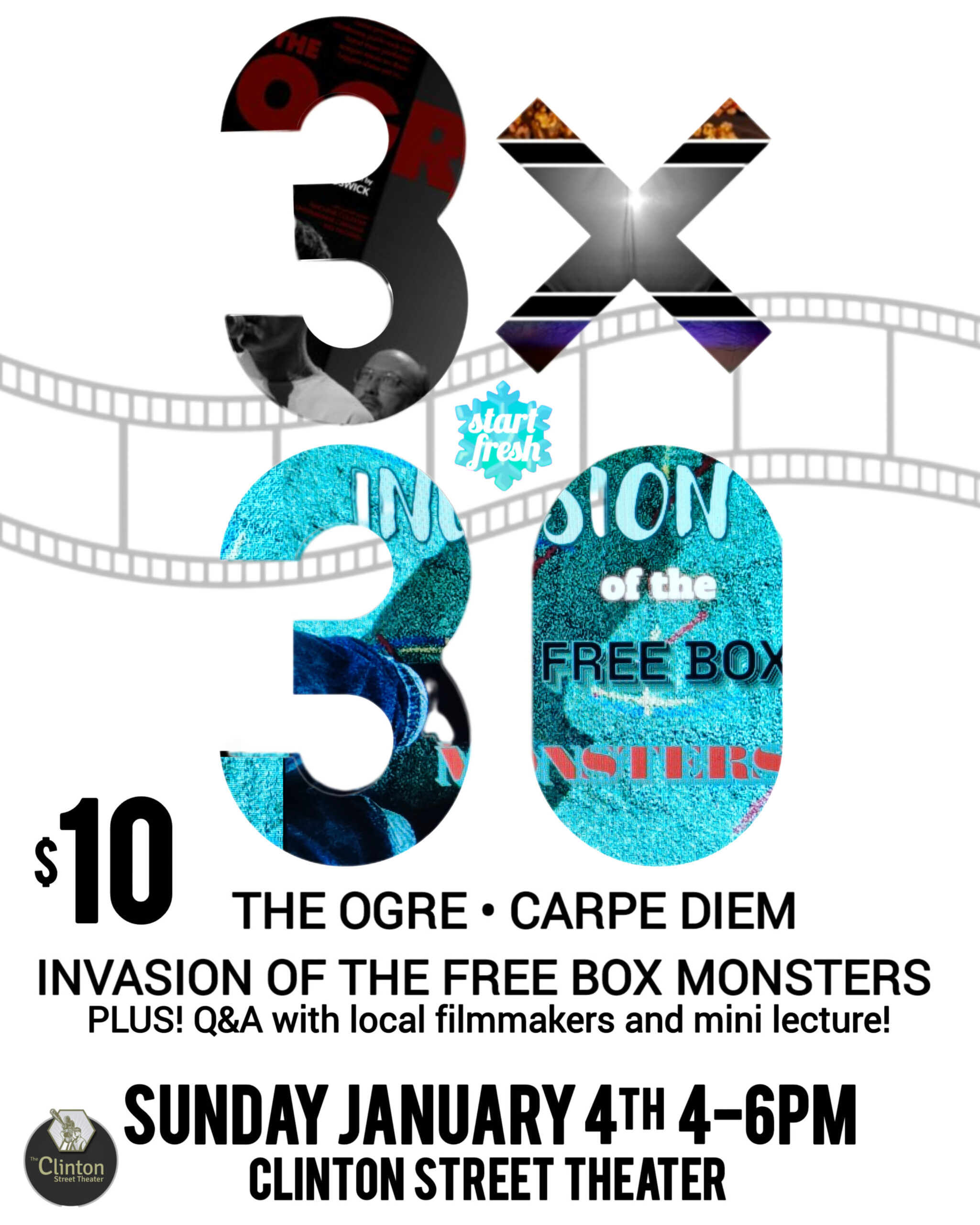 Three short films presented by Start Fresh Fest: The OGRE, Carpe Diem, and Invasion of the FreeBox Monsters.